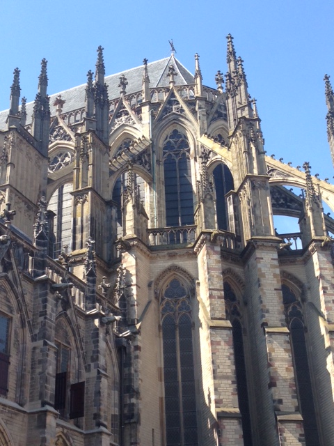 We walked a bit further and we discovered the beautiful Labyrinth gardens in St.Martin’s Cathedral (Domkerk) .St.Martin’s cathedral is the main cathedral in Utrecht and once connected to the Dom Tower but due to the collapse of its nave from the Tornado in 1674, the two building have been separated.This church was once the largest church in the Netherlands.What remains of the interior is still of high quality and extremely ornate with many vaulted arches and colorful stained glass windows. This is the lone church in the Netherlands that has a close resemblance to the style of the Gothic architecture.The building has a sole 367 ft tower named Dom tower which is Utrecht’s landmark. I was rather surprised to see the serene green surroundings inside the square of the cathedral. It has a fountain in the middle and the naves creates a remarkable shadow from the afternoon sun that creates a very relaxing atmosphere. Unlike the other Dom that we’ve visited, the garden has no graves, only a Labyrinth that my daughter loves.
