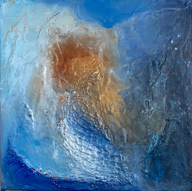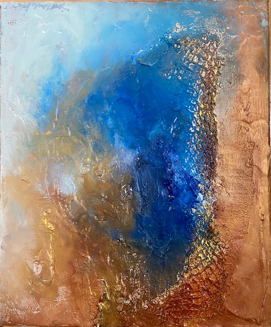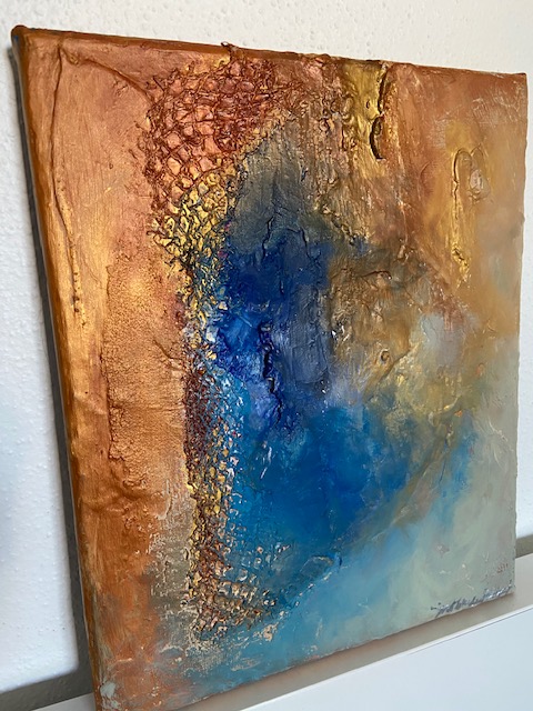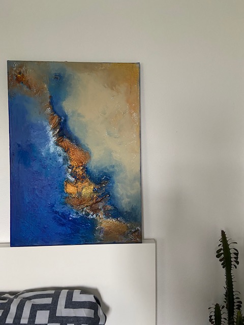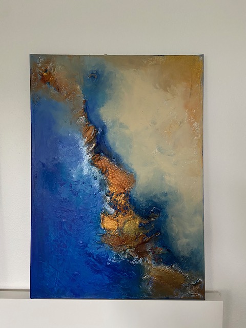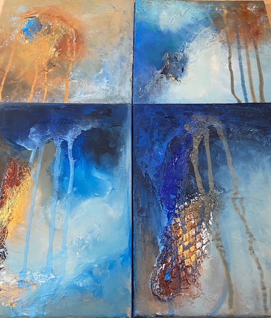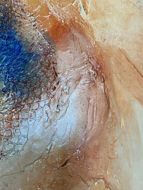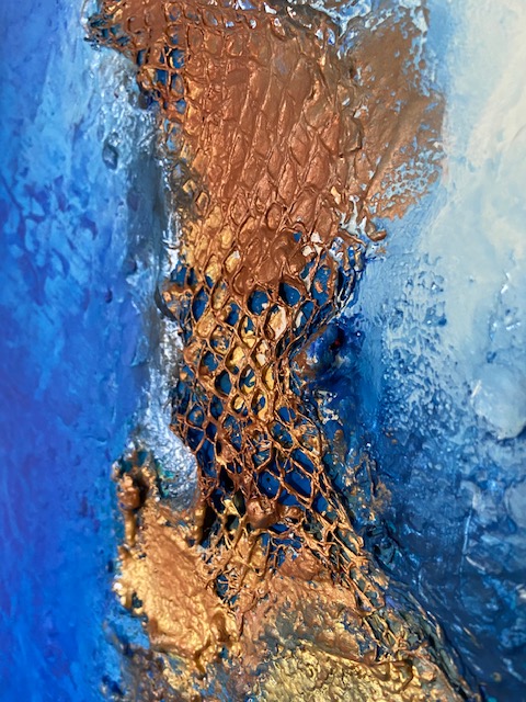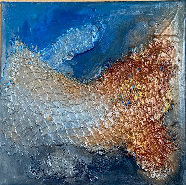 I am using lots of Aquamarine blues, cream, gold and copper accents, carribean hues and an illusion of oceans and islands in my creation. The sea and tropical hues have a very big impact in my paintings. I think blue is such a dominant color that I always use it in all my work.Without blue, I think a painting can be dull. What about nets? I think the texture of nets against the canvas is perfect to create the gradient that I wanted to achieve.Sometimes I´m thinking that I would want to catch a wave and dive back into my childhood or the other way around.