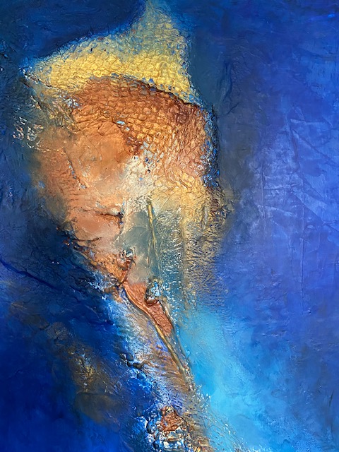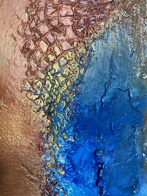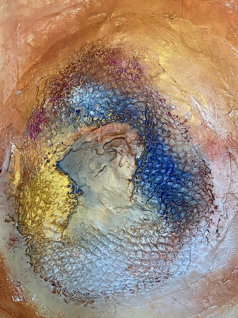 A close up detail of one of my artwork InfinityNets where I used net packaging from Lemons that I buy during the anxious times of Corona Pandemic. Nothing is wasted, only creating a beautiful twist of gold, blues and great myriad of textures.
