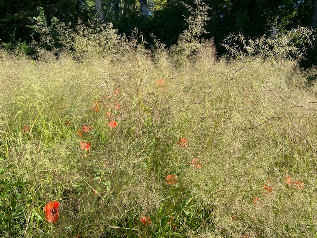 Poppy flowers hidden with bushy weeds, creating contrast of pure wilderness