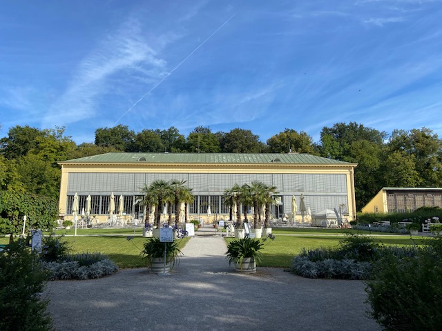 This is the Schlosscafe´in Palmenhaus. A green Oasis right inside the Palace garden´s premises. A place where visitors can enjoy warm drinks and cool their senses with ice cream surrounded with Palm trees.Of course, you can´t get in without a mask!