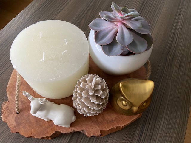 With a simple large round candle, a gold owl deco piece, plus a cute succulent plant in one wooden tablet, then its all set. Isn´t it uncomplicated?