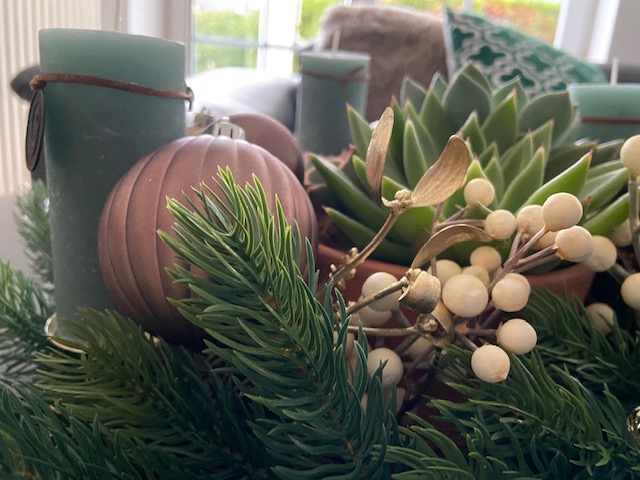 I think it is a great idea to pair your Adventkranz with the motif you have with your Christmas tree or other decorations so it won´t overload your overall Christmas decorations. I don´t like too many decorations and colors especially if you have a small space. I find them messy so I try to minimized to tone down the shimmers and I stick to neutral colors.