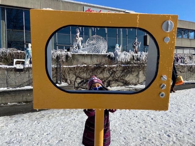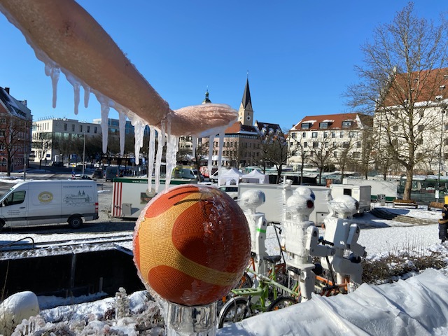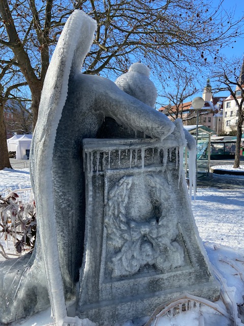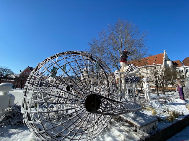 We had a row of days with cold temperatures up to approx. minus 16, and these Ice figures just came in time. The front yard of the Stadttheater was transformed into a little winter wonderland with frozen figures. It really depics our current frozen state,with the pandemic and lockdown as well. My most favourite figure was the man with dark cape holding a skull, the robots cycling and my daughter adored the frozen Dinosaur.