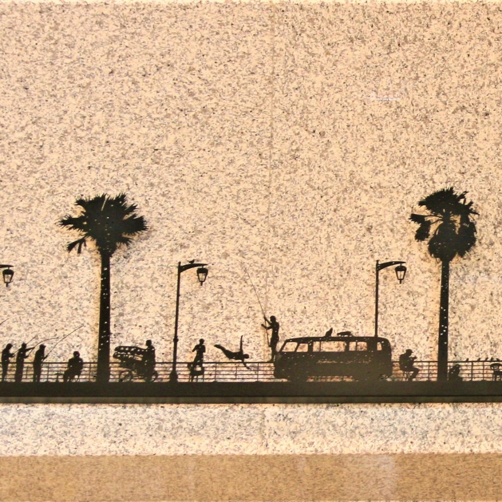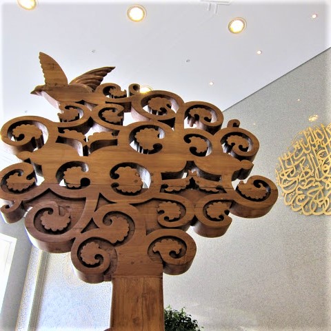 Back to this Mural, it´s in black against a beige wall and shows the every day life in Kuwait–fishing, diving, and of course, the rows of Arabian palm trees! Another impressive Tree Art I saw was the “Samarkand Tree”, located inside the main Lobby of the building. This was done by a Kuwaiti artist, Jafar Islah.
