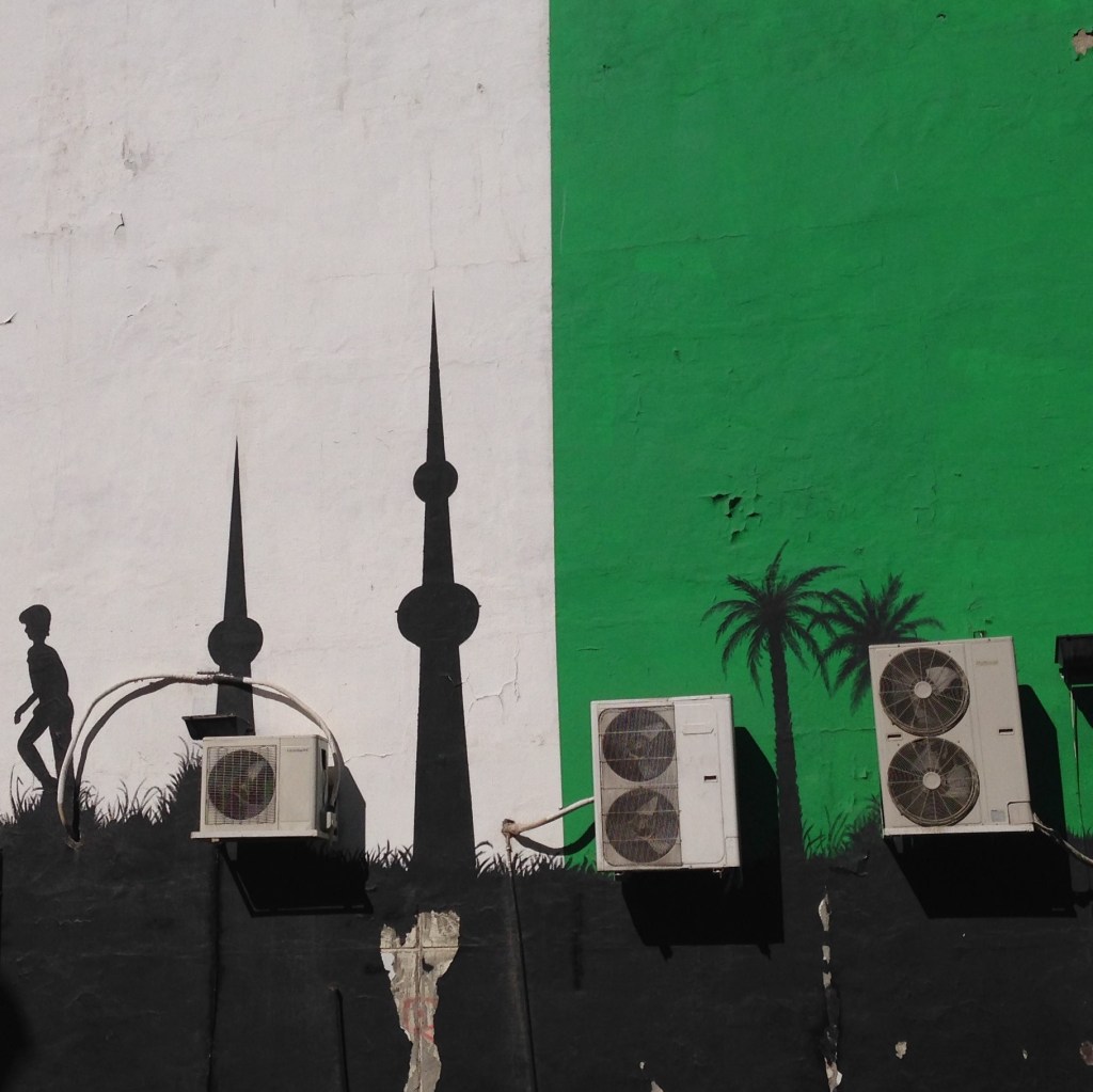 Another worthwhile Public Art mural I found was in the heart of the Old New Souk Mubarakiya, created by Thouq, in the center of Kuwait.Shown here is the famous landmark showing the colors of Kuwait, Black, red & green. Of course, the infamous Kuwait Towers, and palm Trees, in Art!