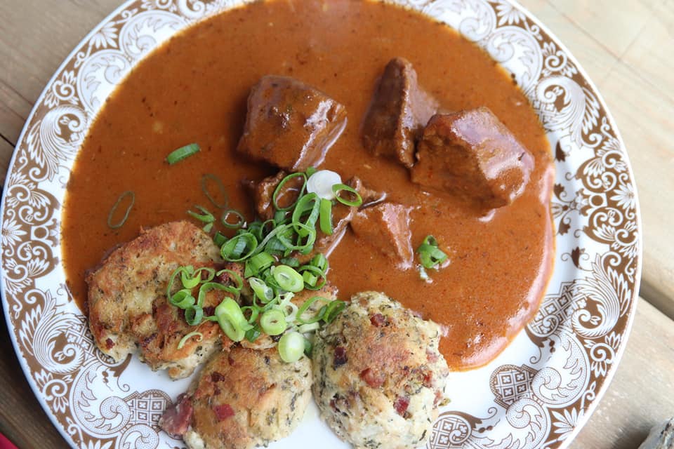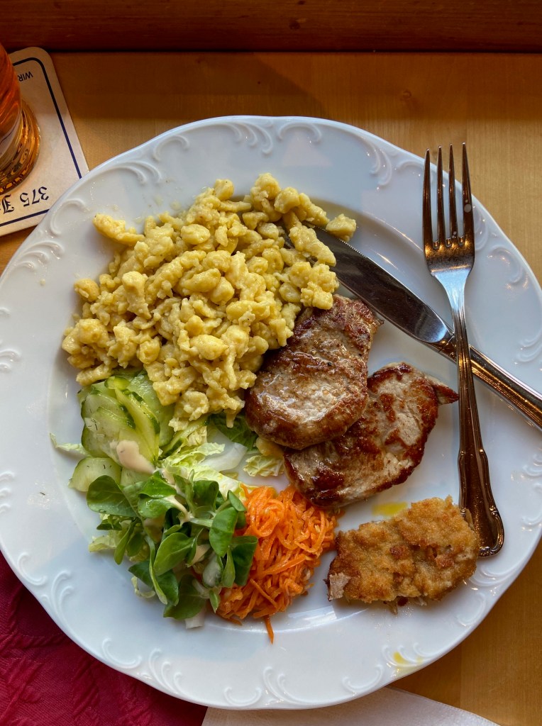 Other famous Bavarian dishes are Schnitzel, Gulasch, a pork or beef stew with dark sauce ,Rouladen (rolled meat) Knödel or a ball made up of some kind of noodle and their Spätzle. Bavarian food is commonly paired with potatoes, (fried or cooked), and side dishes of Sauerkraut and fresh Salad mixes.