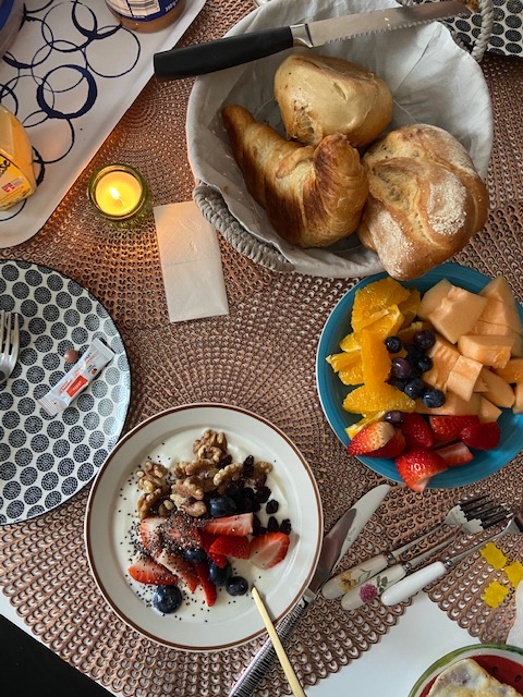 Our normal breakfast at home, breads, fruit slices and Musli or cereal