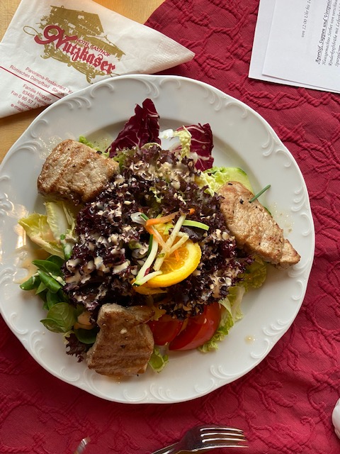 German salads are mostly with Vinaigrette, with lots of Essig ( vinergar) so make sure you tell the waiter when you order if you don´t prefer this dressing.