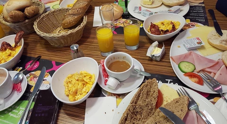 Typical German breakfast —ham, bacon, Cheese, scrambled eggs, and some “Dunkel” breads and “Semmel” -Buns . Germans loved Marmalades and Butter. Preferred drinks are coffee, Tea and orange Juice.