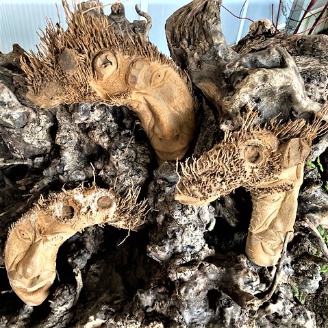 I saw these exhibition near the Maki-Reich inside the Orchideeen Hoeve in the Netherlands. I forgot the name of the artists but I really love looking at these poker faces.They are hard tree barks but somehow the artist played with it skillfully. The facial expressions are so unique and it really gleamed when the spotlight is directed to it.