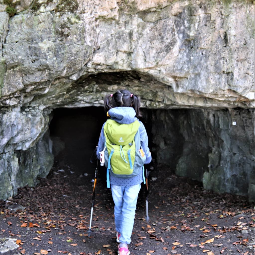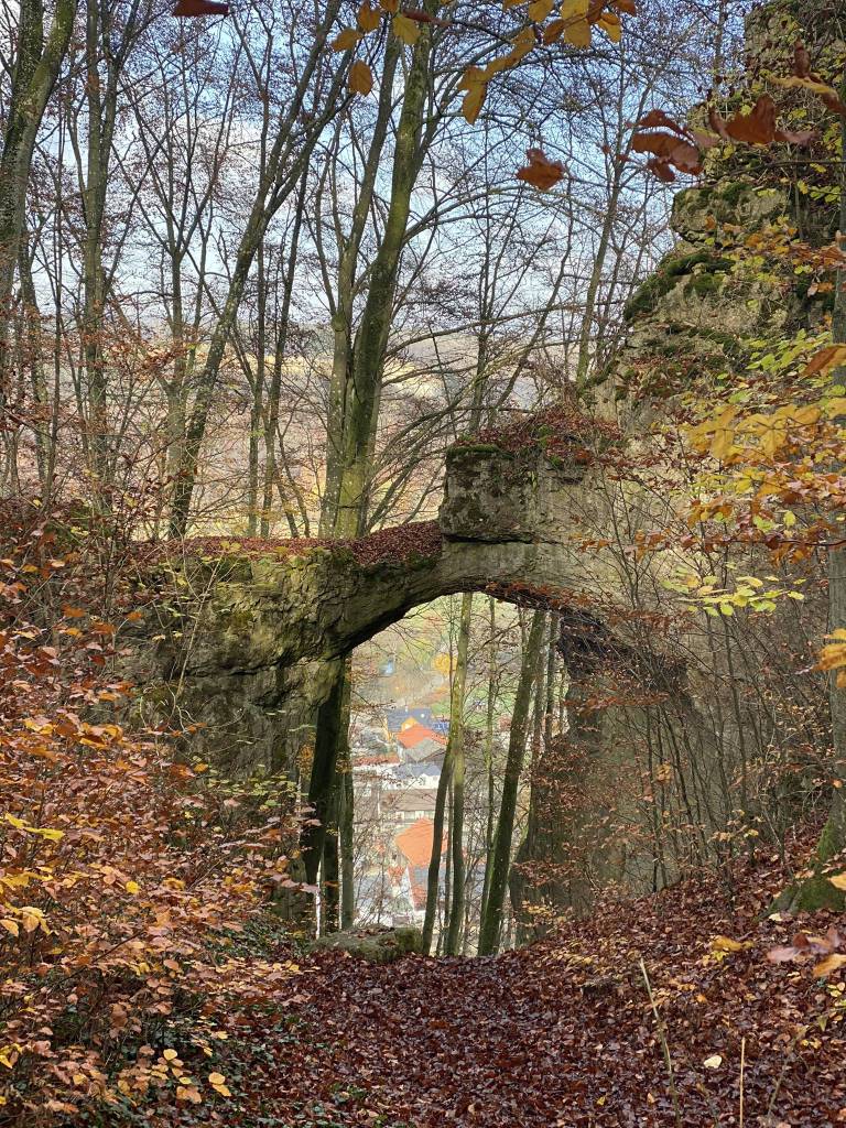 For days we´ve been itching for a good autumn family hike , lucky enough, I had a weekend free so then off we go.The weather was great , and after breakfast, and only half an hour drive, we arrived to our new hiking place–in Unteremmendorf . The main attration in this place is the “Torfelsen“, or the Rock Gate. It´s a natural rock formation splendour and believed to be a part of the entrace of the three castles ,named “Torfelsen“, “Saufelsen” and “Hubertusfelsen” which were believed to be owned by Messrs. Emmendorf, a family of servants from Eichstatt.There is a 25- meter deep cave that attached to the gate and we thought it is quite cool to explore it. My daughter have never seen a cave, a real one alone!