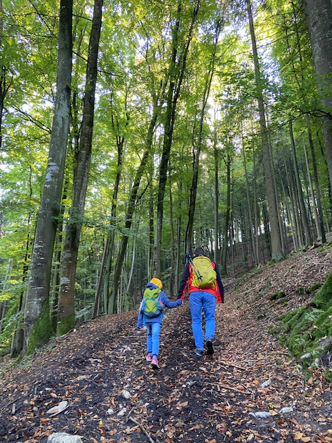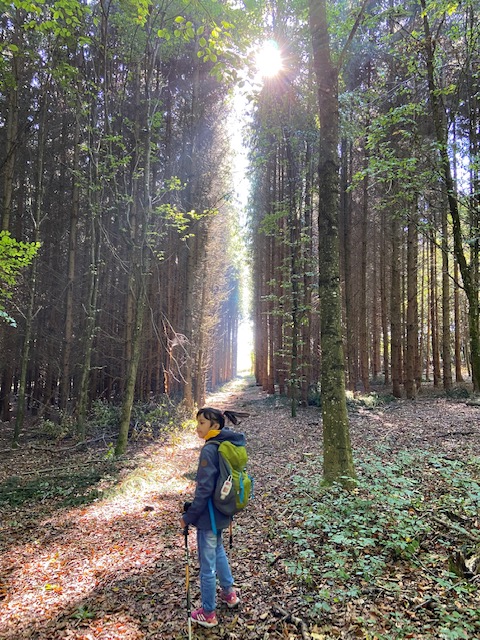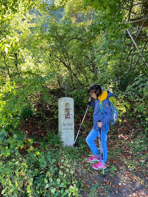 Anyway,this hike was a friendly family hike for us, approx. 7 kms and as usual, we took our time and made few stops to snack and let my daughter play.This path is also famous for mountain trail biking and connected to other panorama hikes with Ruins and castle views here in Bavaria.My daughter urges to bring her hiking stick but I know that in the middle of the hike,it´s me ending up carrying it, which is really typical.