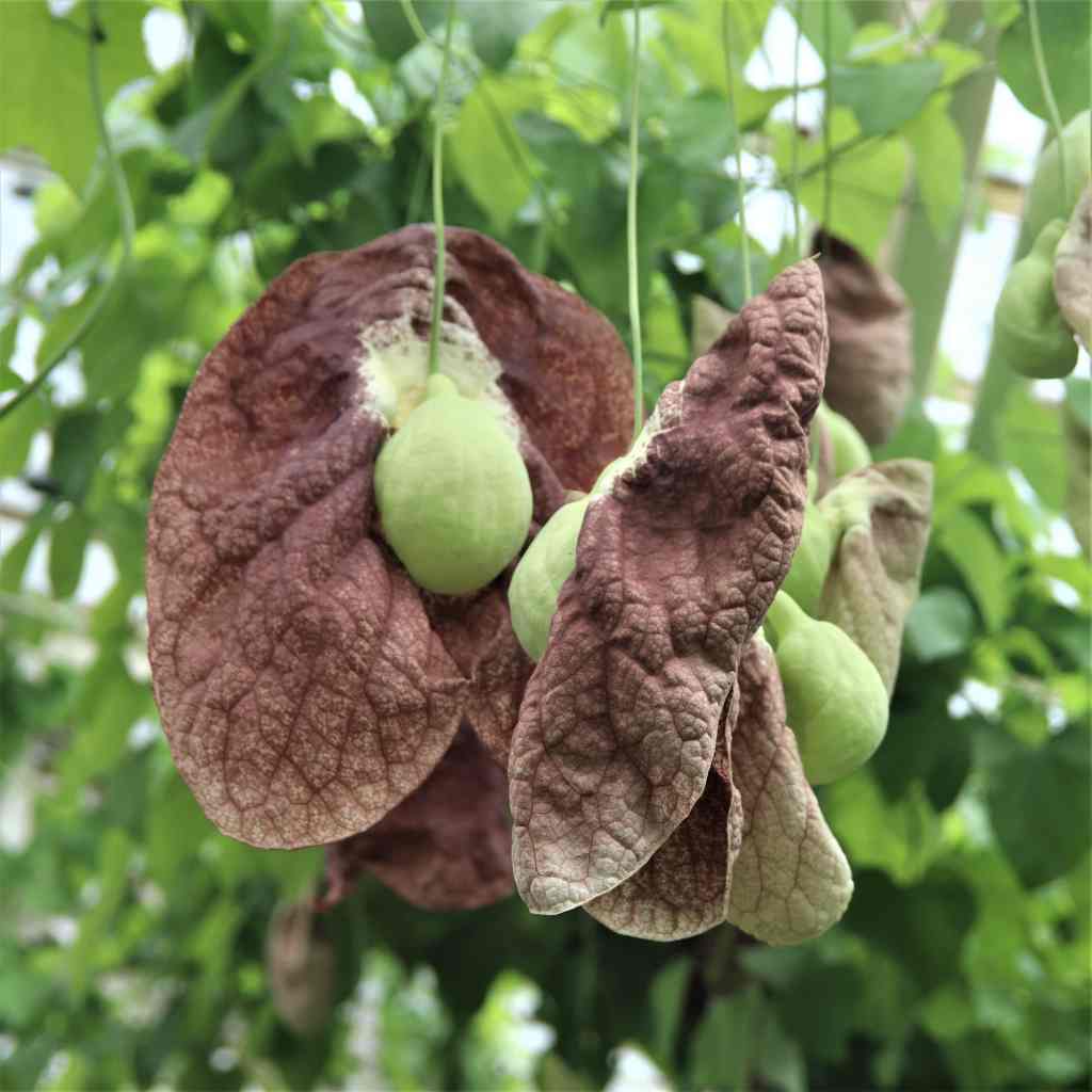 Thank you… i think it´s not a fruit, it´s actually an exotic flower!Giant Dutchman’s pipe (Aristolochia gigantea) is the name. I saw it in Botanical Garden in Münich.