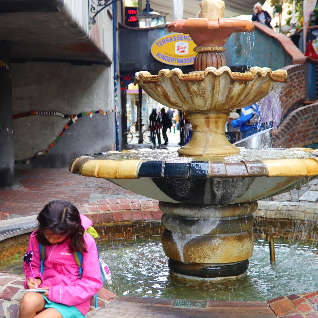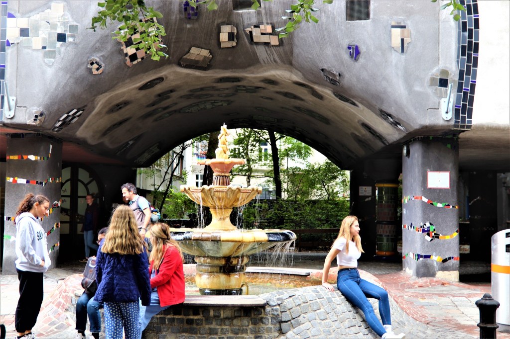 On the back side of the building stands the Hundertwasser Village which is also another wonder. It has a shop,an exhibition hall of the artist, a bar and cafe, a souvenir shop and a square where people meet together under the shade of the trees.There´s a nice fountain outside and people sit around cozily.On top of its floor grows more than 30 trees, as high as 15 meters, which serves as the natural habitat of animals in Vienna and making the city more sustainable.