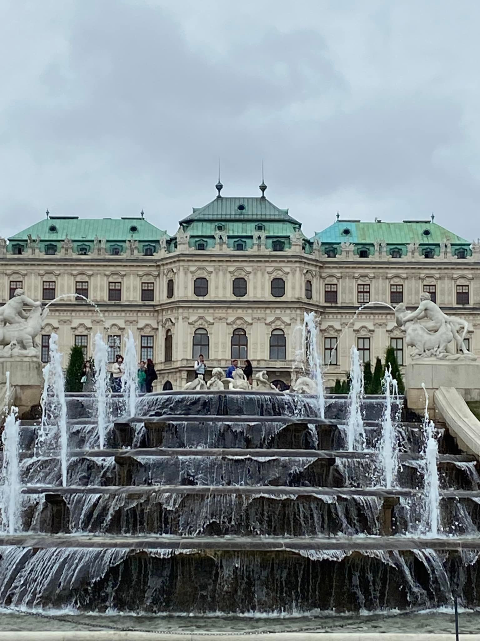 The view of the fountains from the Upper Belvedere seeing the exterior facade of the Lower Belvedere.
