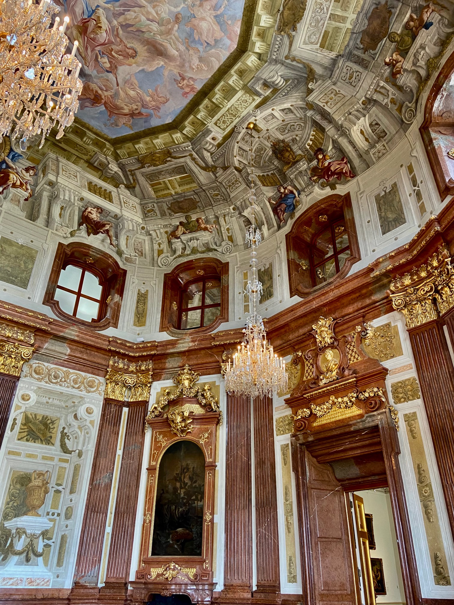Another highlight of Belvedere is the grand Marble Hall. I spend lots of time looking up and gazing at this beauty. It was marvelous and truly intricate, with all these rich ornaments and details in the dome, walls and floors.Up there, celestial beings in flowing pastel garments hover over glitzy chandeliers and gazing tourists. Almost as spectacular is the fact that the Hall itself stretches over two levels.