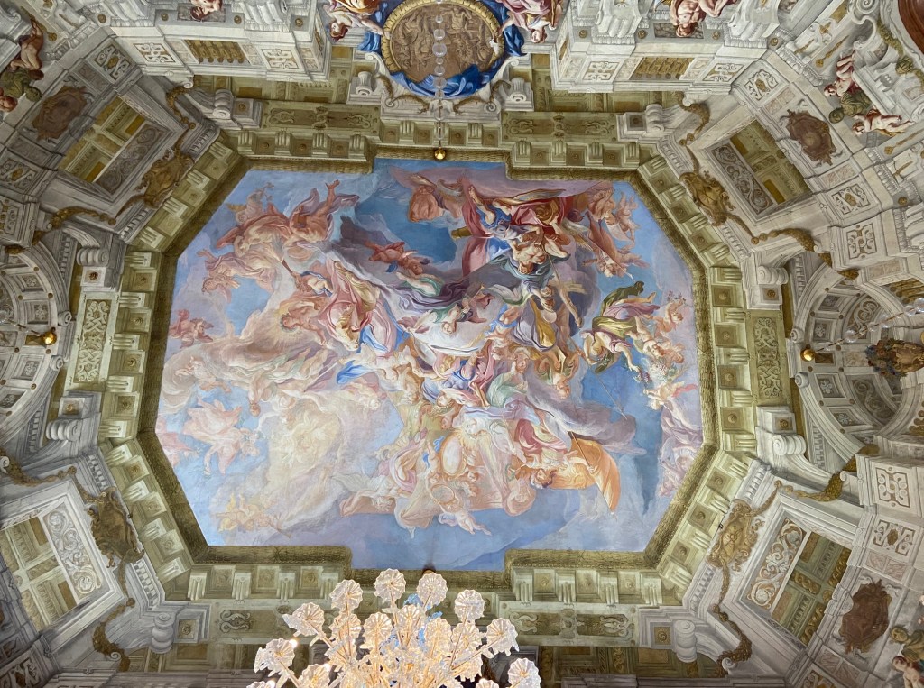 Another gem, the majestic Carlone Hall simply dazzles and shining. The weather outside is so gloomy and grey, but inside we are blinded by these beauty. Its three dimensional frescoes covering the walls and ceilings open up the baroque universe: well nurtured ladies in flowing garments, hyper-toned males in acrobatic poses, and two dozens of chubby cherubs spilling water out of amphoras, some holding blankets and flower baskets.Everything is too much in one sight!