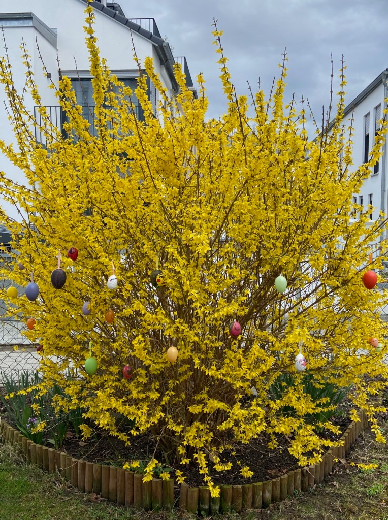 When my yellow Forsythia blooms in the Early Spring, I decorated it as well with these painted plastic eggs. I am going with the flow. I have enough chocolate eggs in the pantry from this year´s Easter collection,reminding me of how sweet it is, the German Chocolate Easter extravaganza!